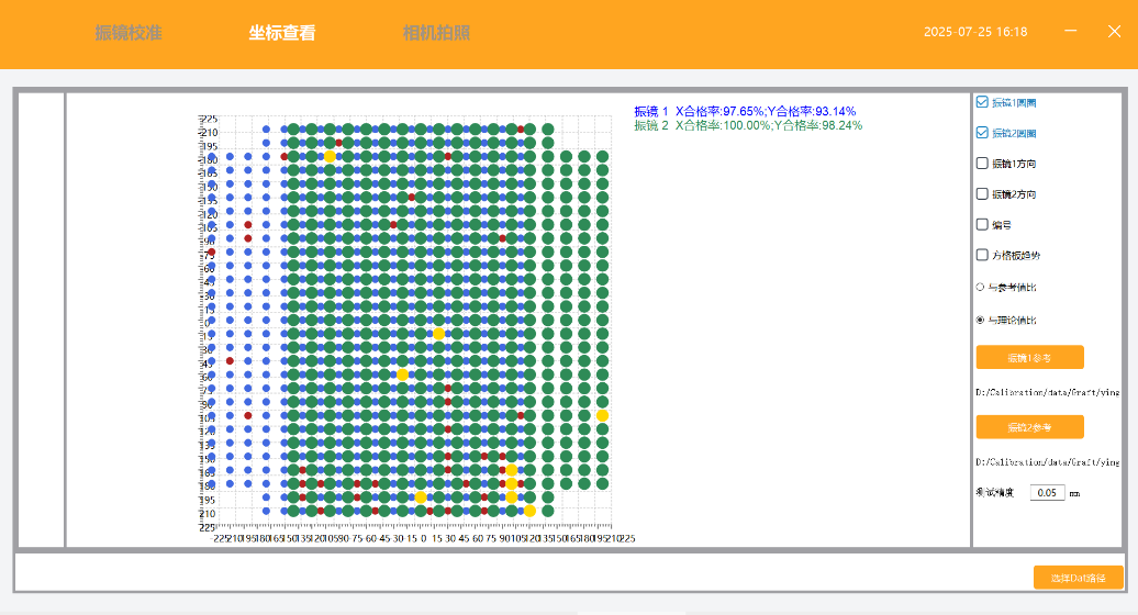 在實(shí)際測(cè)試中,軟件會(huì)自動(dòng)統(tǒng)計(jì)各振鏡在X、Y方向的點(diǎn)位合格率,并以不同顏色和點(diǎn)徑標(biāo)記誤差大小,讓工程師一眼看到“哪里好、哪里需要調(diào)”。