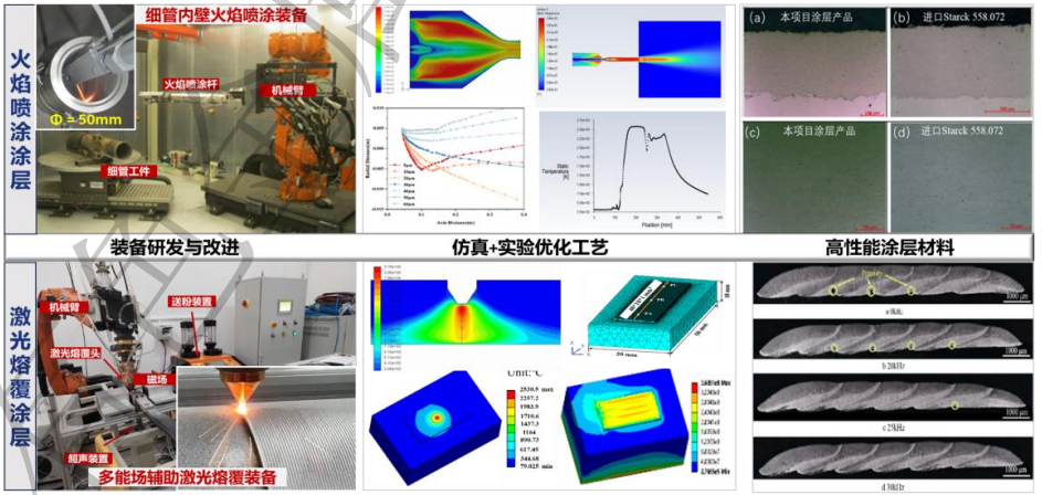 · 專用涂層工藝與裝備:開發(fā)窄徑管(≤50mm)內(nèi)壁超音速火焰噴涂技術(shù)與裝備;研制多能場輔助激光熔覆系統(tǒng),攻克大幅面涂層易開裂難題;結(jié)合有限元模擬多場耦合仿真技術(shù),實(shí)現(xiàn)了高致密度(≥99%)、高硬度(≥1200HV)、高結(jié)合力(≥580MPa)的含鎢及鎢基涂層工藝的全流程優(yōu)化。