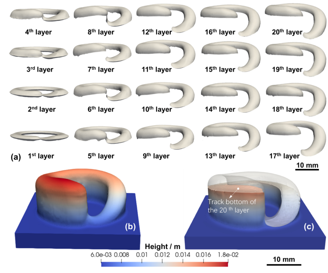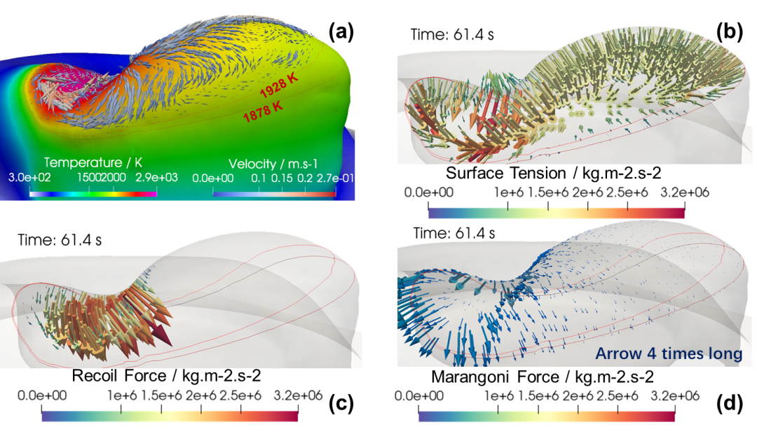 該研究揭示了激光增材制造過程中熔池內(nèi)部作用力對沉積偏差的影響機制,在介觀尺度探明了蒸汽反沖壓力、表面張力、熱毛細力在不同傳熱條件下對熔池形態(tài)的具體作用,繼而闡明了封閉路徑結(jié)構(gòu)在掃描路徑處產(chǎn)生偏差的根本原因。