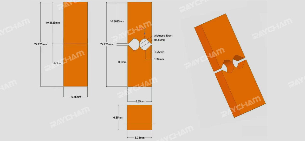 該零件為鈹銅合金材質(zhì),材料厚度6.35mm,需要精確加工兩個對稱的圓弧,圓弧最小處的厚度要求在0.03mm以內(nèi)。