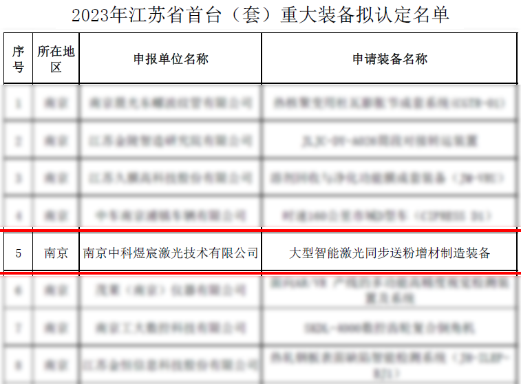 2023年9月4日,江蘇省工信廳對《2023年江蘇省首臺(套)重大裝備擬認定名單》予以公示。中科煜宸的“大型智能激光同步送粉增材制造裝備”被認定為江蘇省首臺套產(chǎn)品。(2018年,中科煜宸LDM8060金屬增材制造裝備獲江蘇省首臺套裝備認定。)